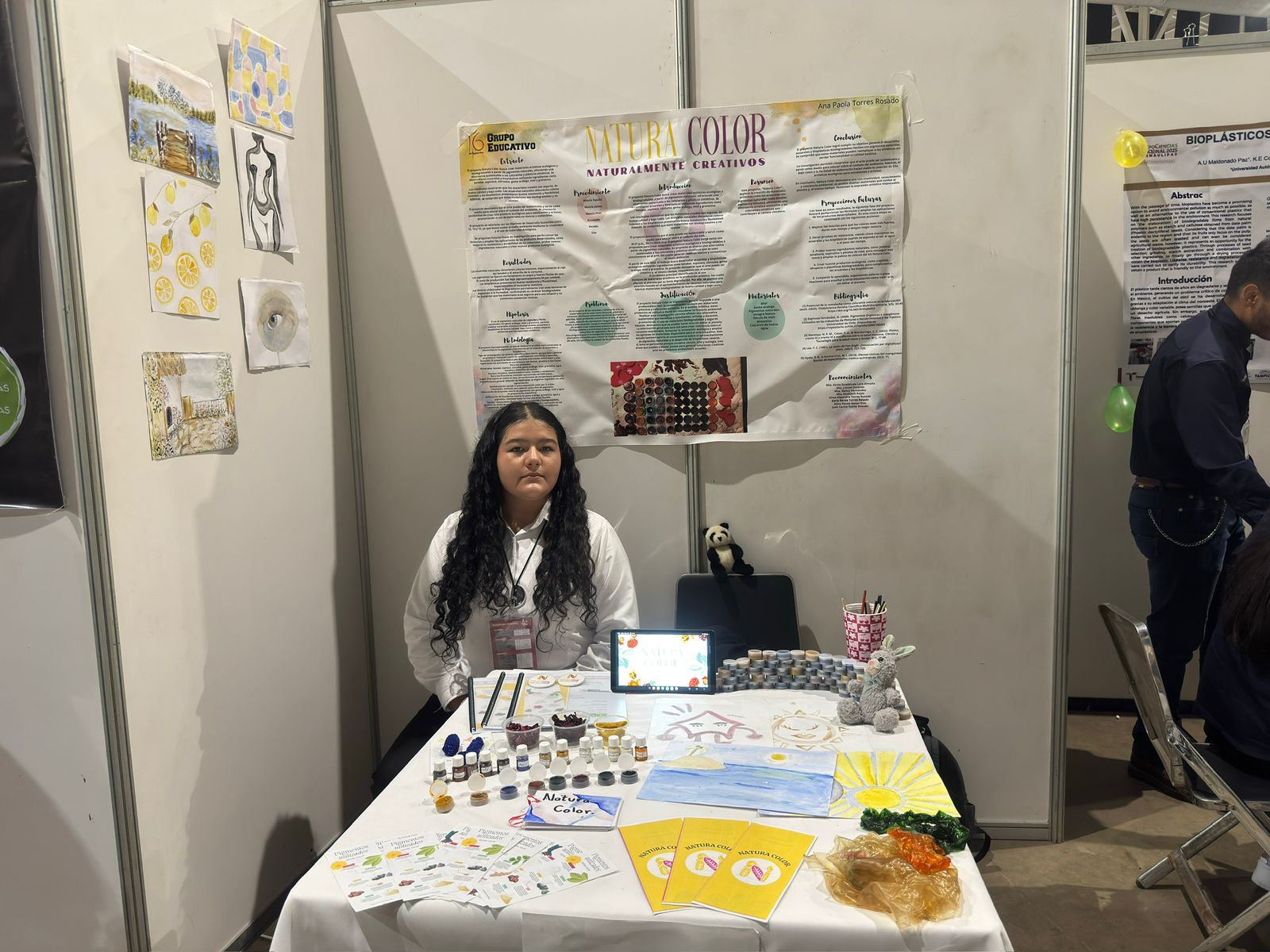 La alumna presentó el proyecto “Natura Colors”, una propuesta que surge como respuesta a la necesidad de reducir el impacto ambiental de los materiales artísticos tradicionales. A través de la creatividad y el conocimiento científico, el proyecto plantea la elaboración de acuarelas y bioplásticos ecológicos utilizando pigmentos naturales como betabel, espinaca y cúrcuma, así como ingredientes biodegradables como goma arábiga, miel y grenetina. Con ello, se busca ofrecer alternativas responsables frente al uso de colorantes y plásticos sintéticos que generan contaminación.